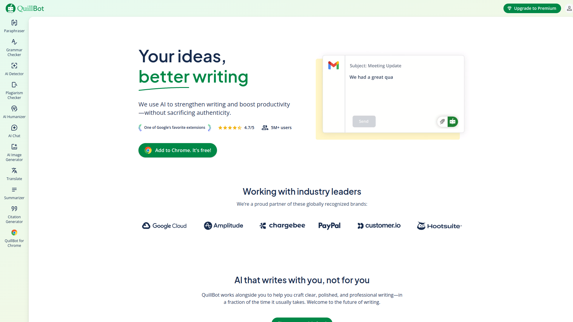 Writing is rewriting—but the rewriting process can be tedious and time-consuming. QuillBot is an AI writing assistant that wraps paraphrasing, summarizing, grammar checking, plagiarism detection, and translation into a single lightweight workspace. Think of it as a comprehensive writing studio that can rephrase your sentences, condense lengthy reports into key takeaways, and flag potential plagiarism before you hit publish.