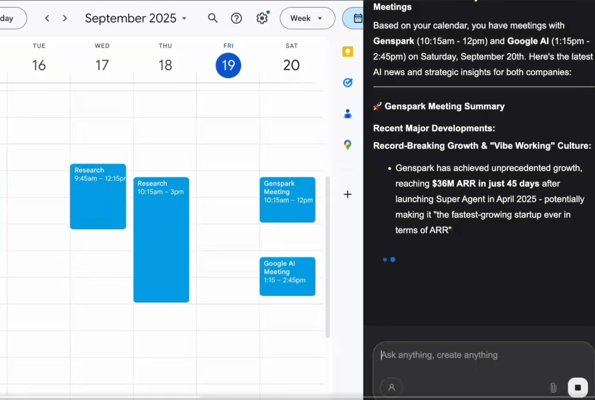 What’s the most important event that eats up the majority of your time in the office? Meetings! Do you know that people spend 2 to 3 hours preparing for a meeting? What if you can save this time? Let’s say you want to prepare for a meeting tomorrow. Open your Google Calendar or any calendar app in the Genspark browser.