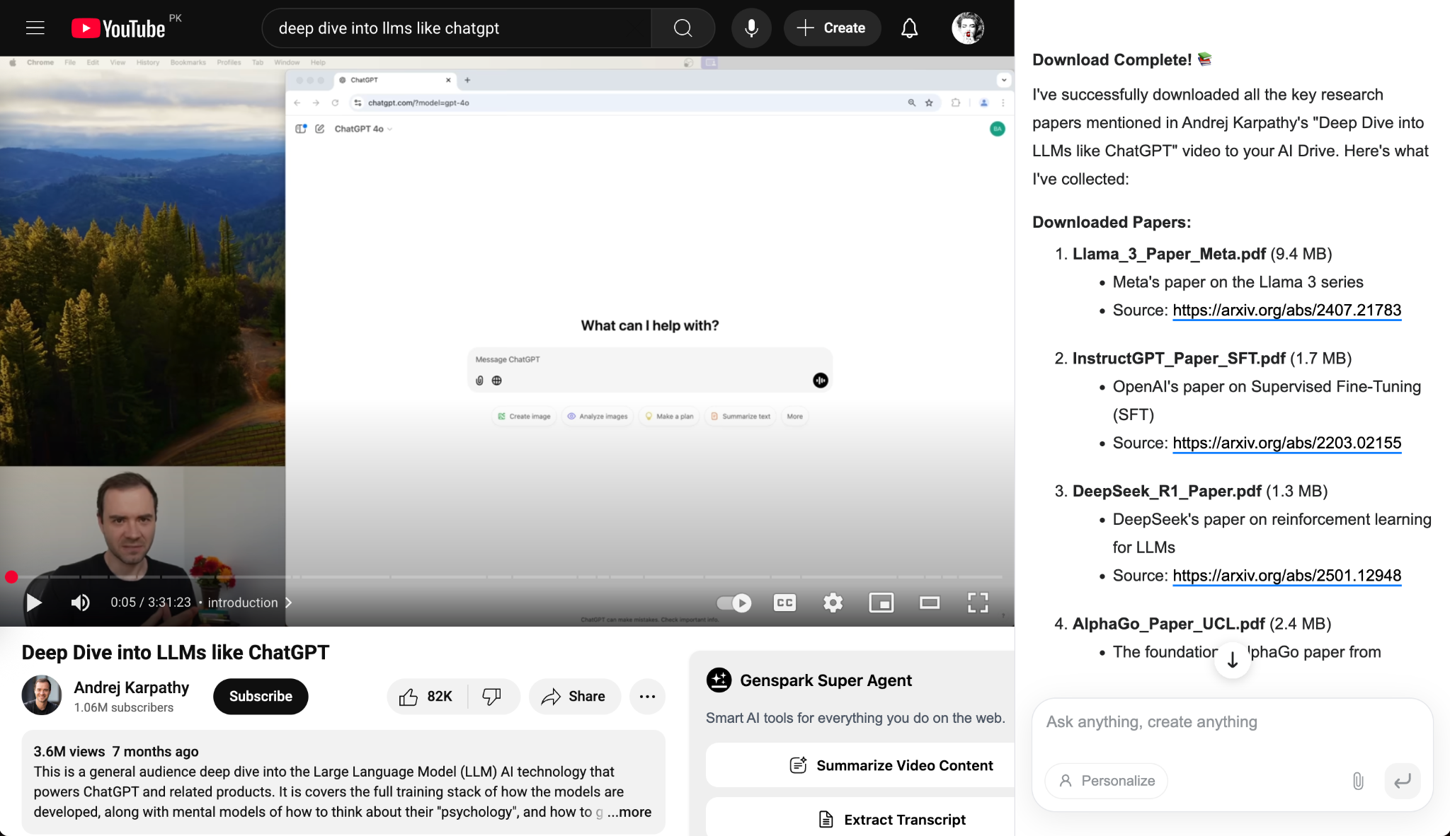 Open the video. Fire up the Genspark super agent. Click the Genspark link in the extensions section and instruct it to download all the papers in the video.