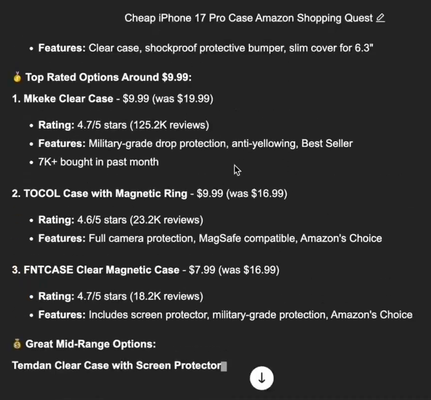 Create a new tab. Open Amazon.com and find me an iPhone case under $10. I want the best options for $20.