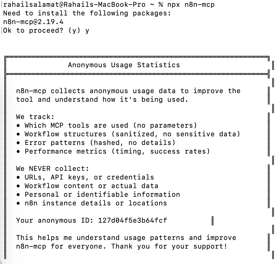 Press Enter on the keyboard, type ‘Y’ if prompted, and you should see the ' n8n MCP server is running’ message. This means everything is working.
