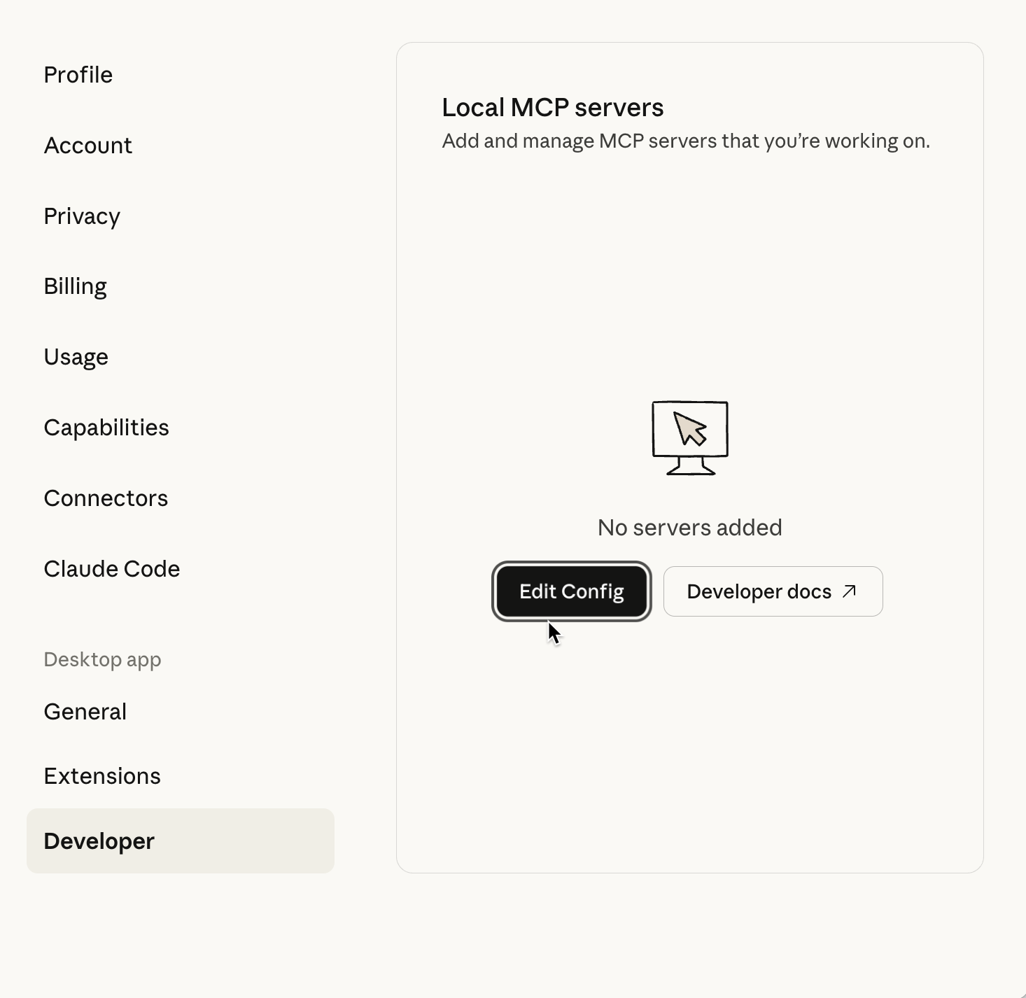 The next task is to connect the Claude account to your n8n account. Open Claude Desktop, click the settings icon, and go to the Developer tab.
