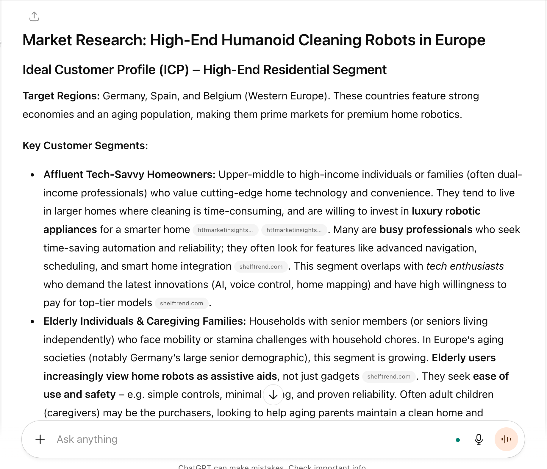 Let’s say you want to conduct market research on the robot vacuum market. Use the following prompt for your marketing use case: