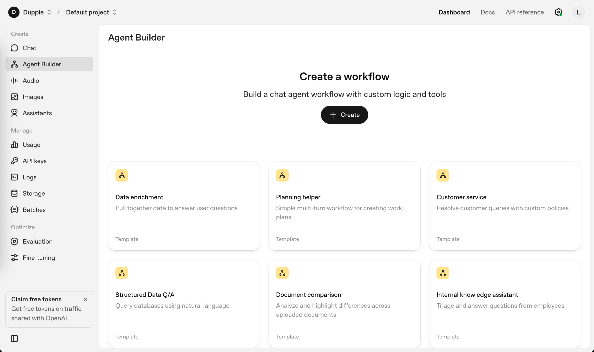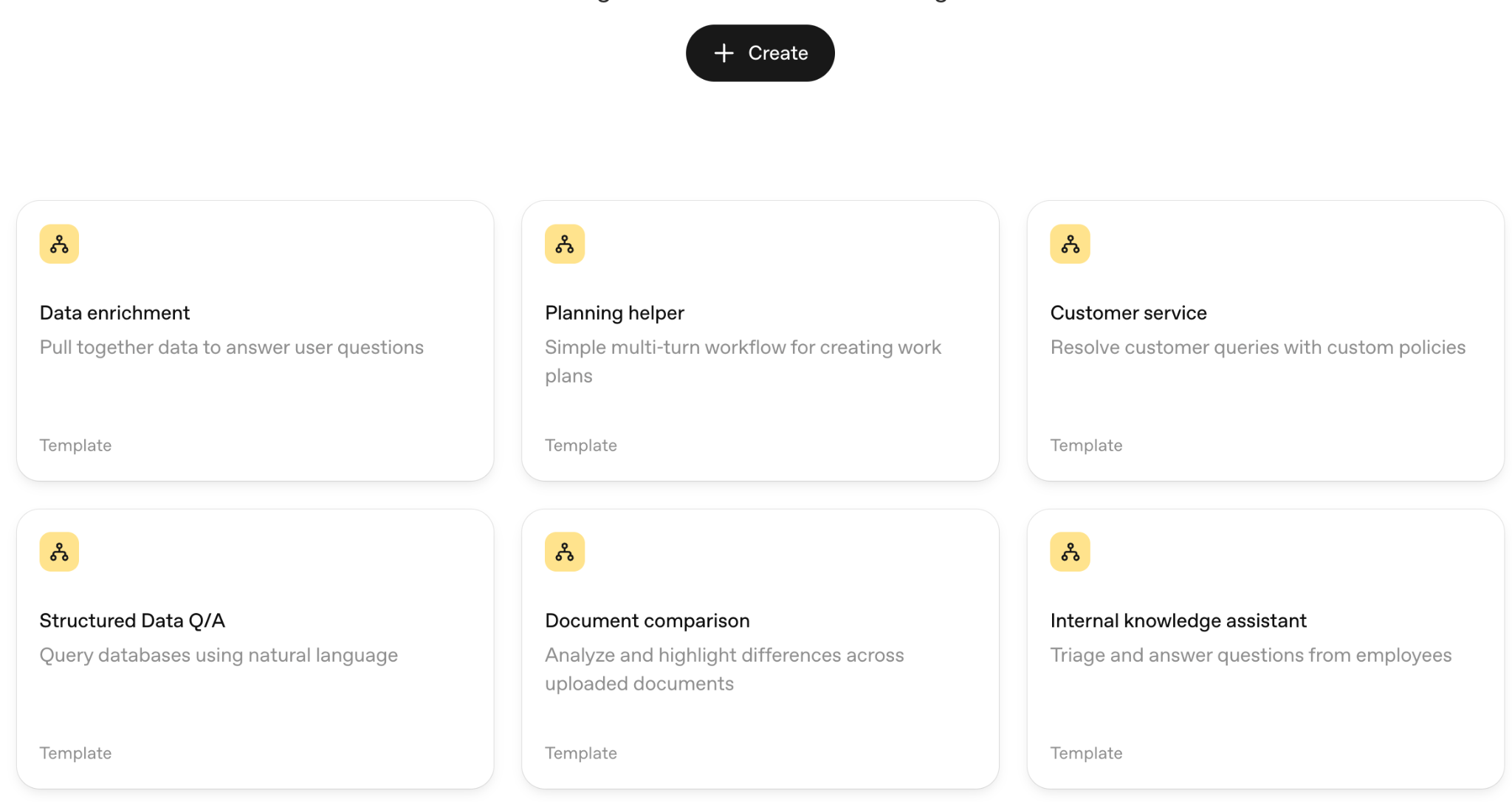 Click Agent Builder in the left menu. Here you’ll build your custom workflow. Click ‘Create’ to start a new agent from scratch. There are a few existing templates to choose from. You can create a planning helper or an internal knowledge assistant by selecting an existing template.