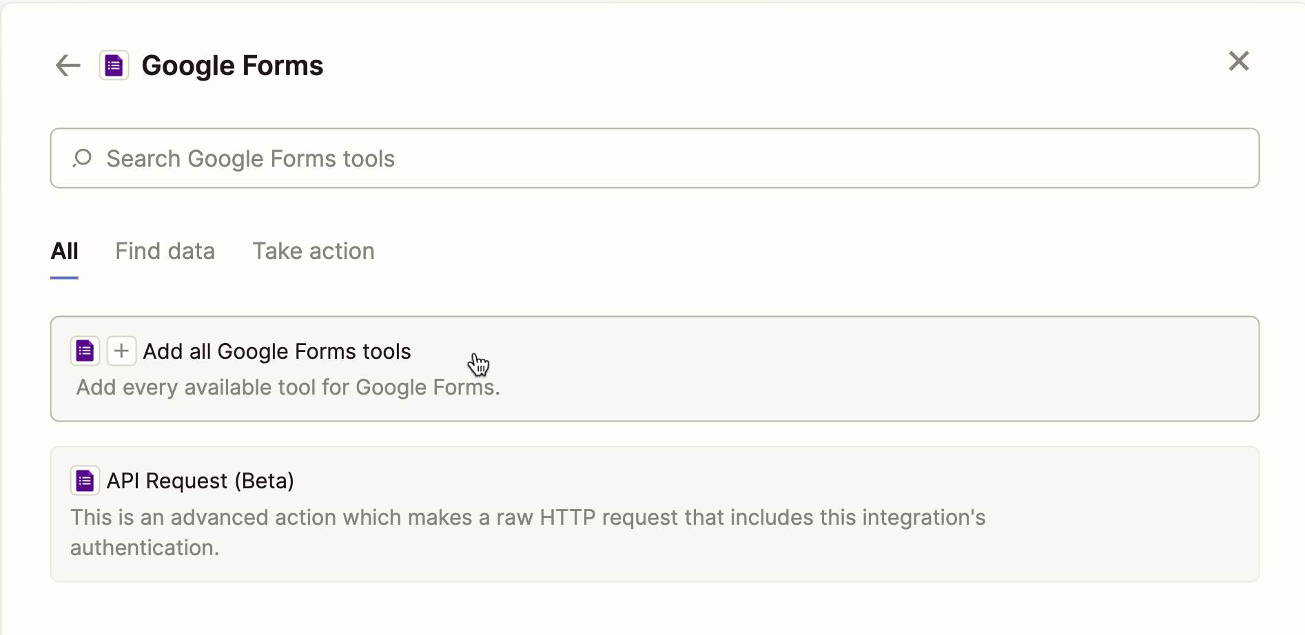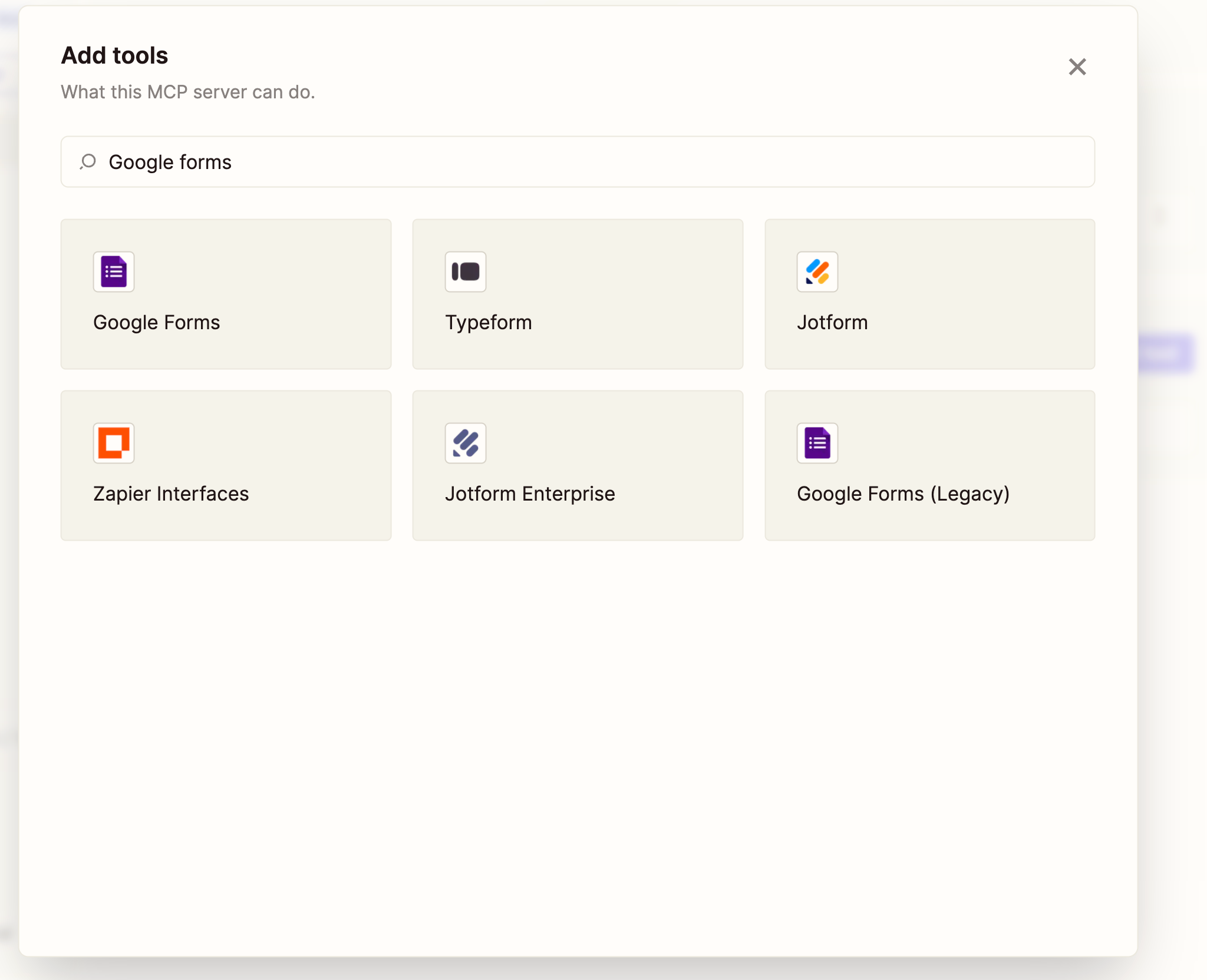 If the Zapier MCP tool integration setup is successful, you will see the selected tool (Google Forms) appear in the list.