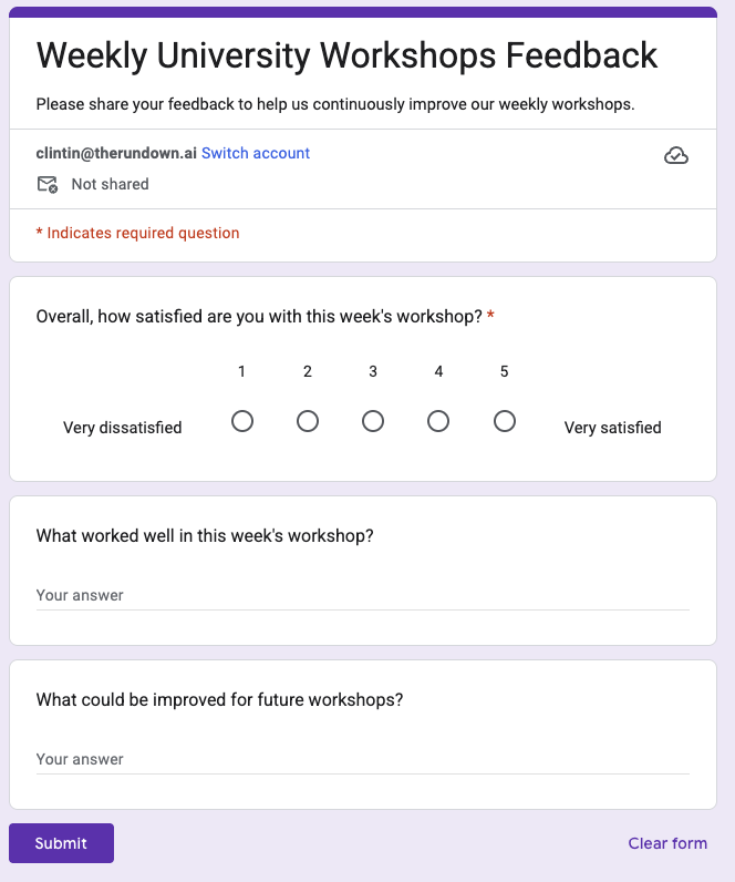 Create a new Google Form with three questions to gather feedback on our weekly university workshops.