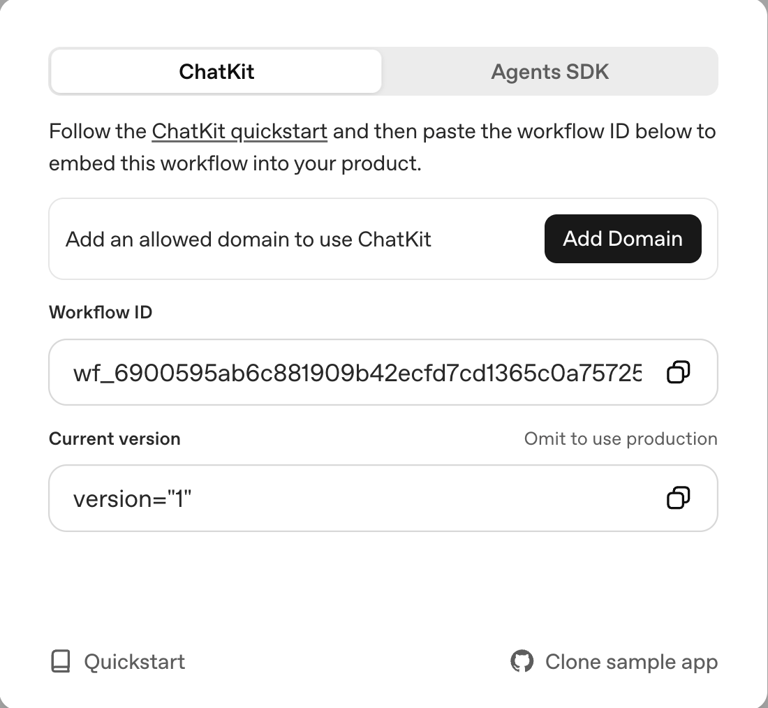 You can add ChatKit or Agents SDK to publish and deploy your agent.