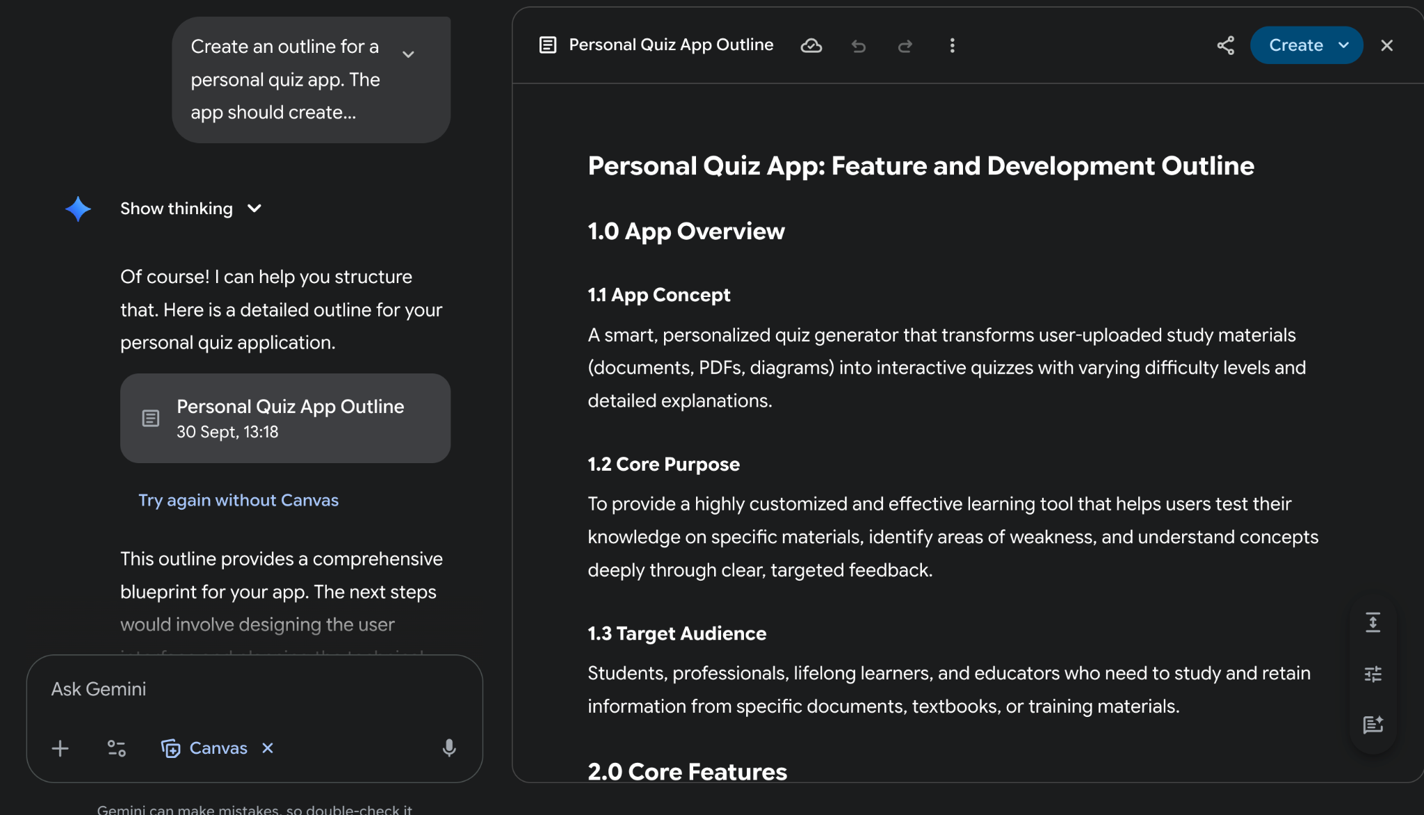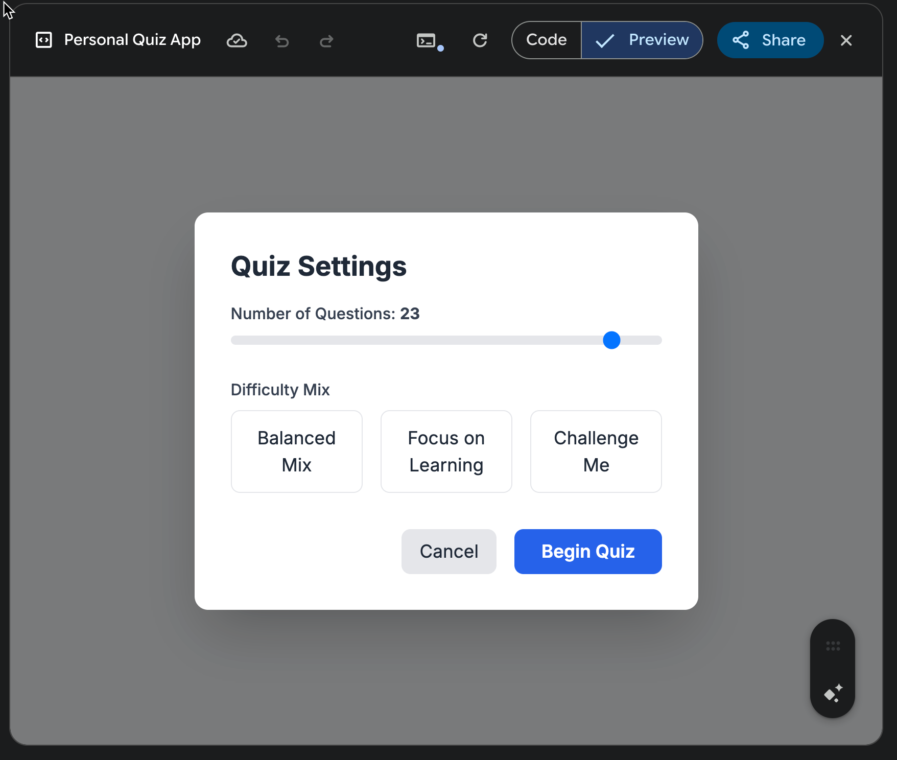 After reviewing and editing your plan, it's time to create the app. Since Gemini Canvas has all the plans it needs to create the app, the process might be quicker. Use the following prompt as an inspiration. However, it is advised to use your own prompt for your idea. This tutorial shows you the steps to execute your idea. And the personal quiz app is just an example. You must refine your own idea and execute it using the steps outlined in this tutorial.