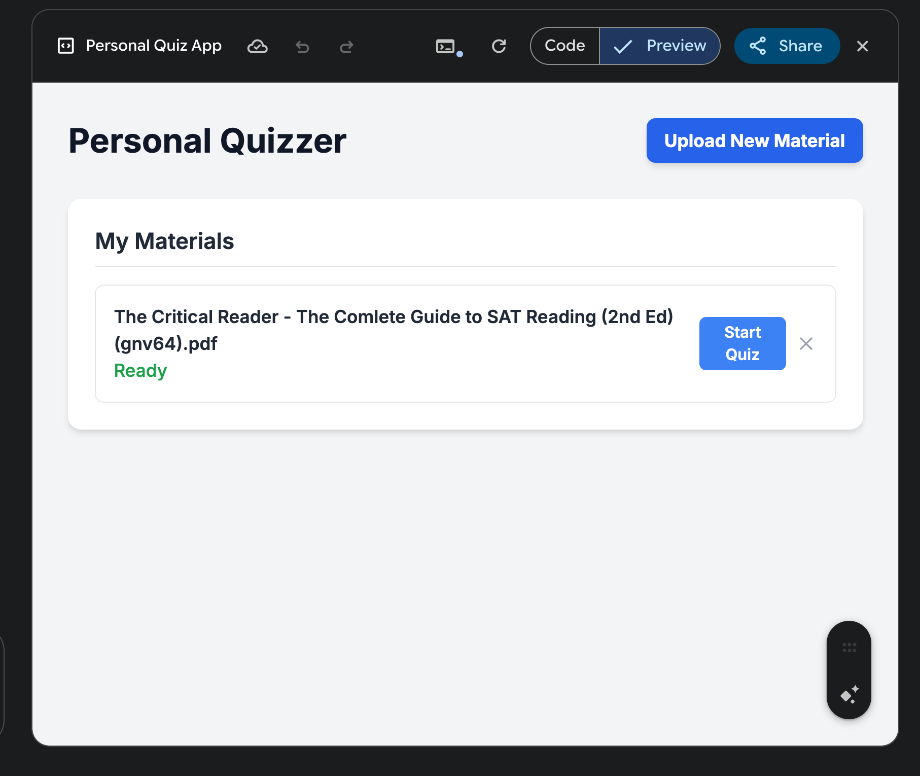 Once it finishes the uploading process, the material status will change to ‘Ready.’ Click ‘Start Quiz’ to check the AI quiz engine.