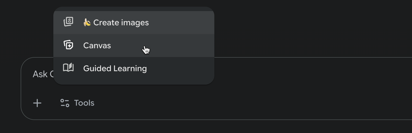 Click ‘Tools’ in the bottom left corner of the chatbox and select ‘Canvas.’