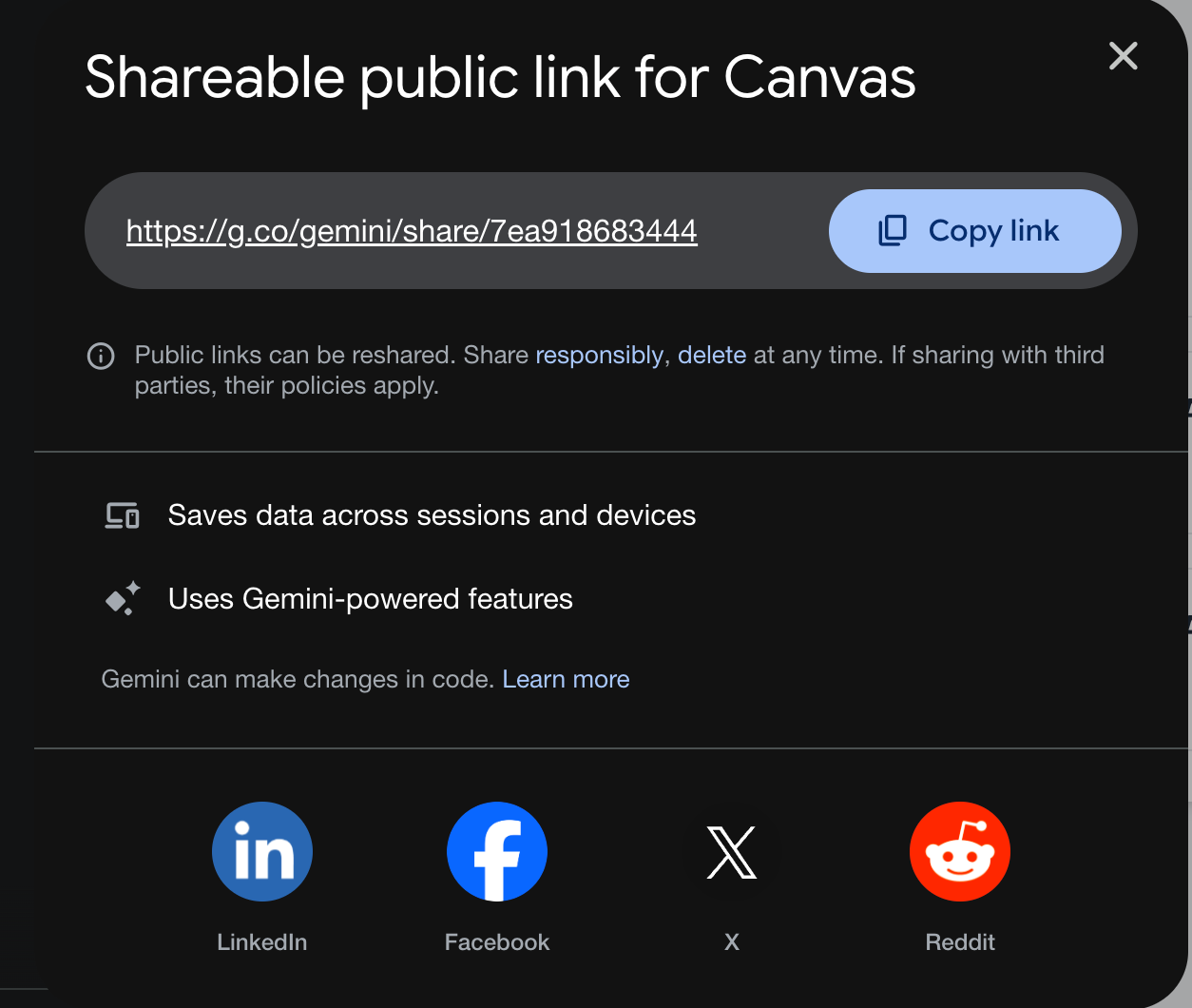 If you want to share the app, you can share it by clicking the ‘Share’ button at the top right corner of the screen. Gemini will generate a link. Copy the link and share it with anyone. There is an option to share it on LinkedIn, Facebook, X.com, and Reddit.