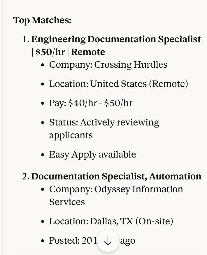 Claude lists all the jobs that match the search parameters we mentioned in the prompt.