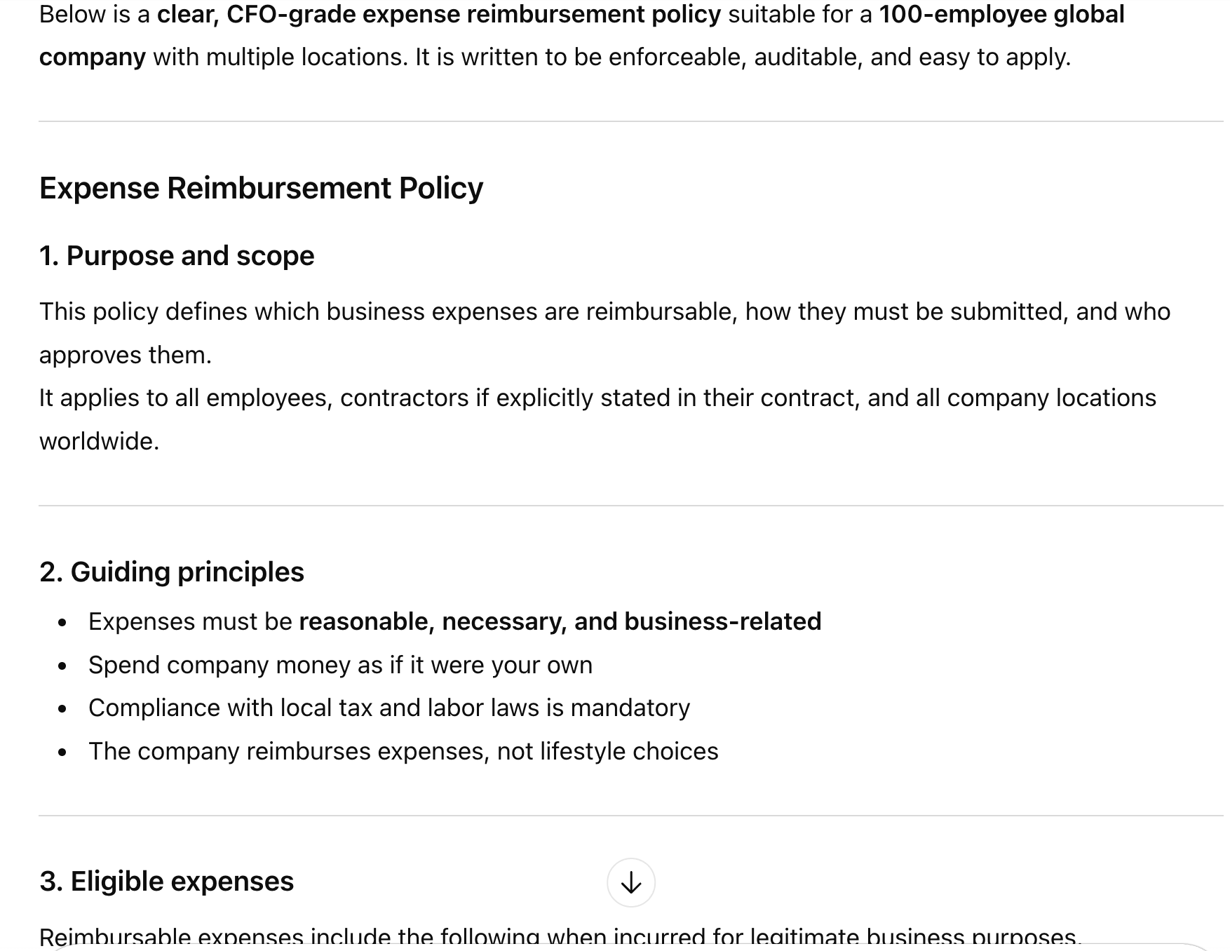 Write an expense reimbursement policy for a 100-employee global company.