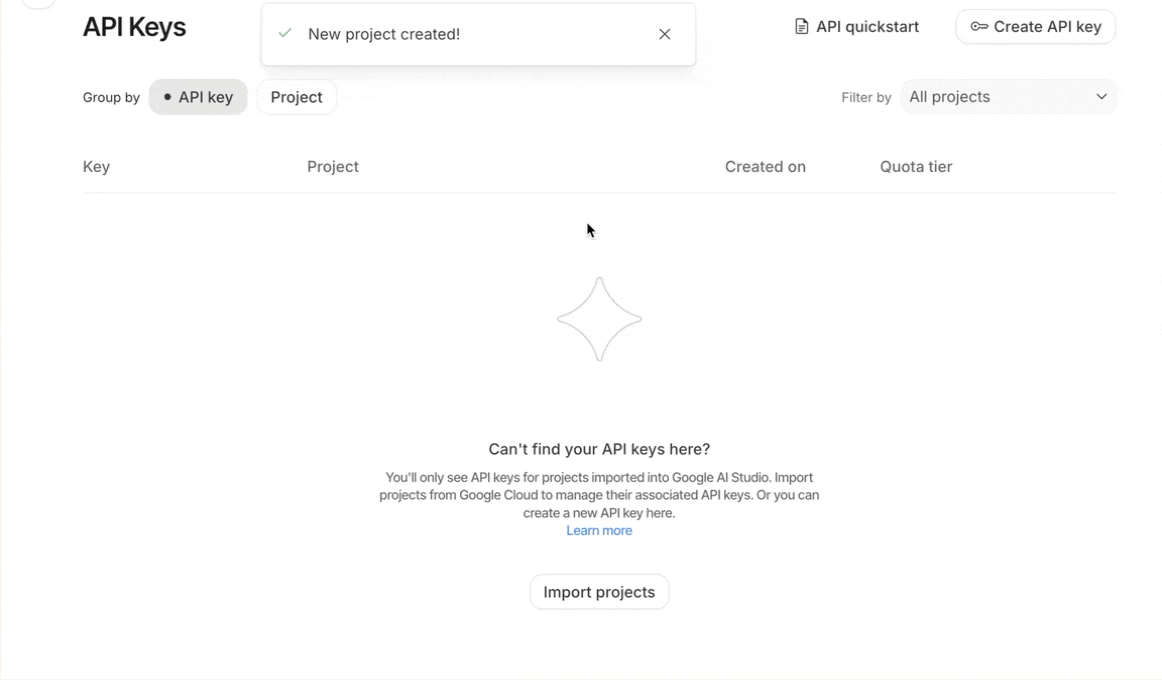 If you haven’t used API keys for any project before, you’ll first have to create a project to generate an API key. Select the imported project drop-down and create ‘Create a Project.’ Name your project and click ‘Create Project.’