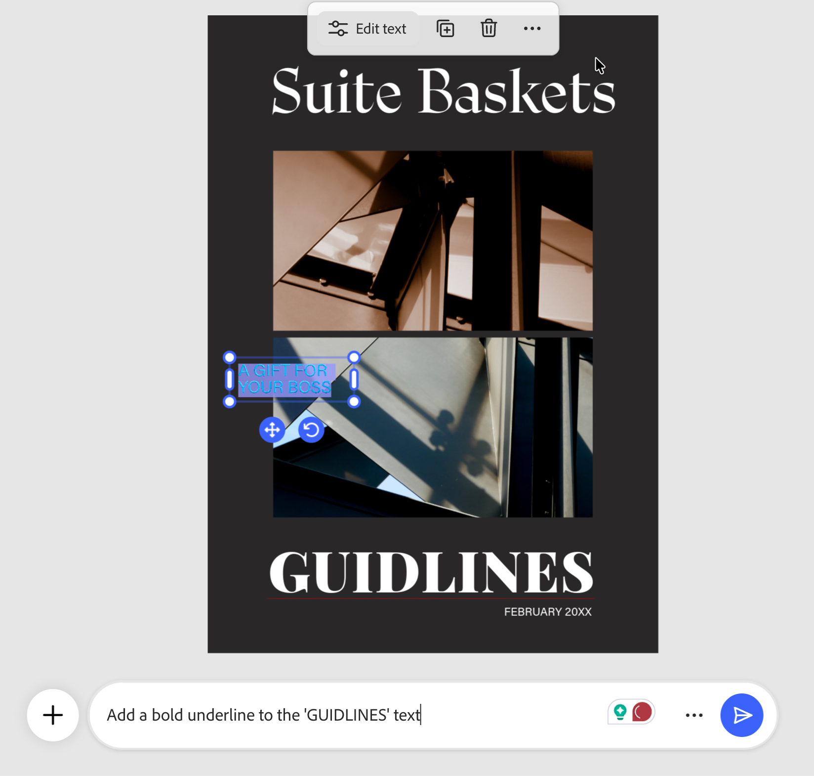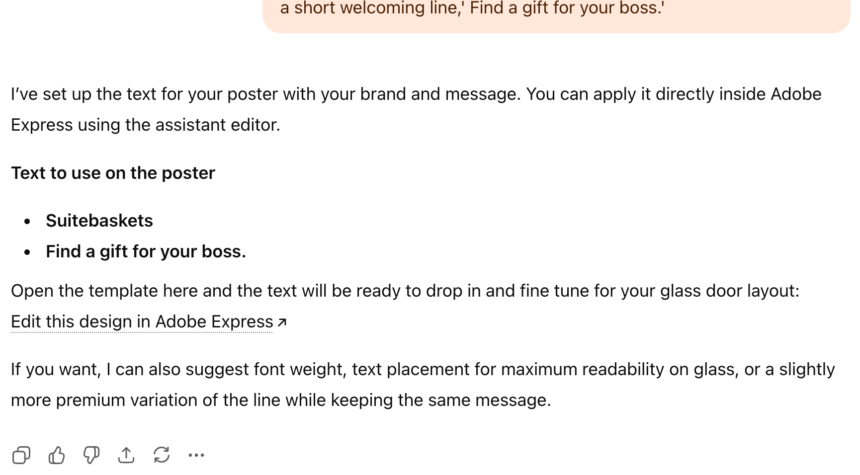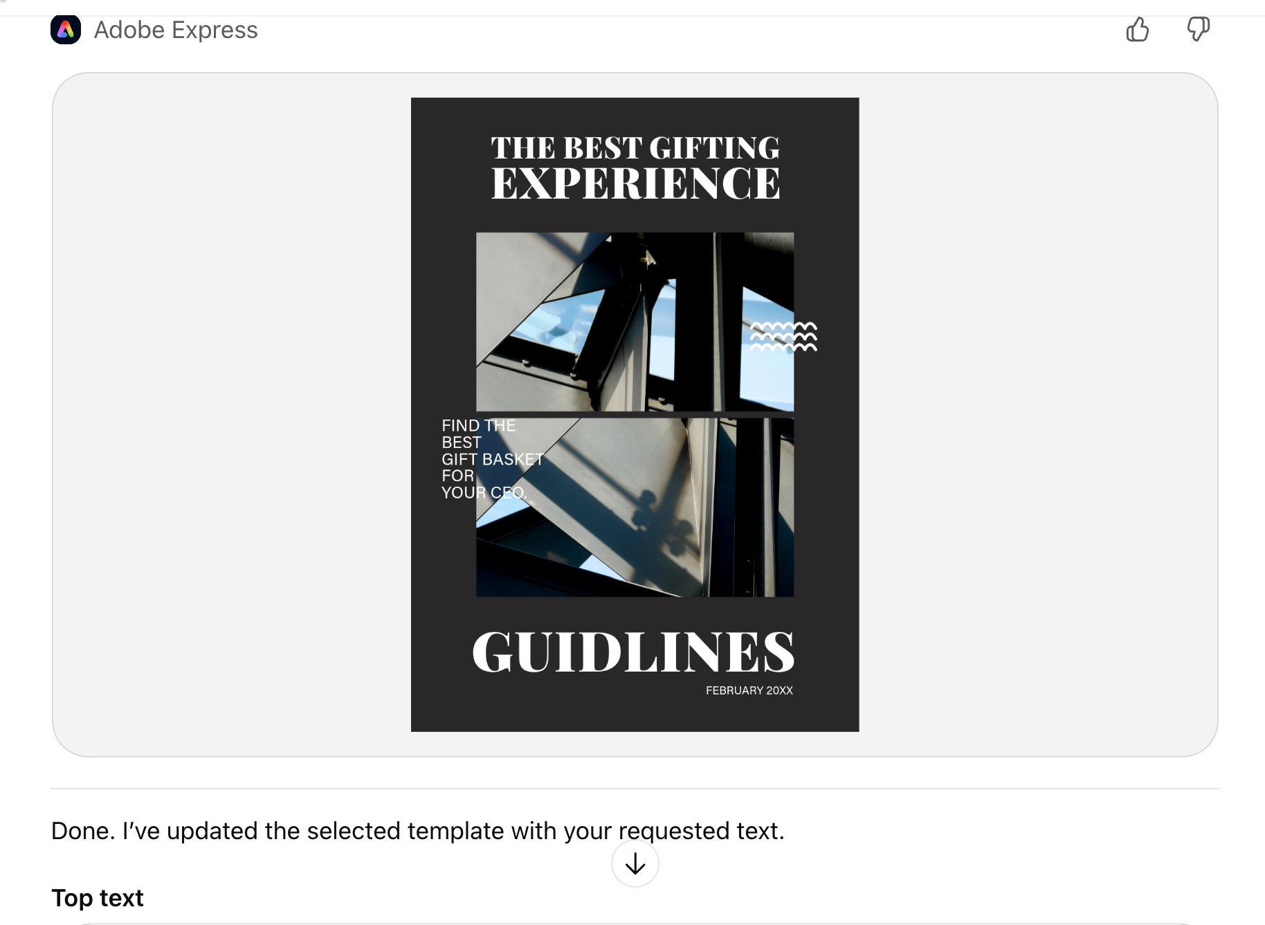 The downside to the Adobe Express plugin is that you cannot change text in any uploaded images of your own. You can create or upload a template and do the edits by prompting ChatGPT instead of going to the Adobe Express site and doing them manually.