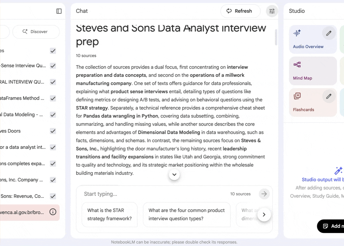 There are multiple ways to prepare for an interview. Ask NotebookLM to act as a tough interviewer and start a mock interview session based on the sources and the video prep material.