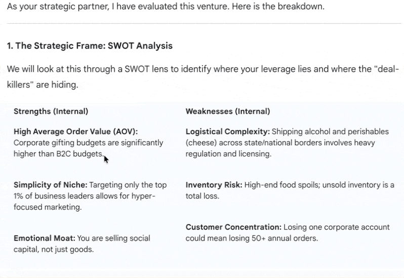 You can also instruct Gemini to become a strategic decision-making assistant and create SWOTs, personas and next steps in minutes. SWOTs and personas take a lot of time to develop. They are the backbone of the strategic decision matrix. A lot of work goes into it. Let’s see how Gemini tackles these important data points.