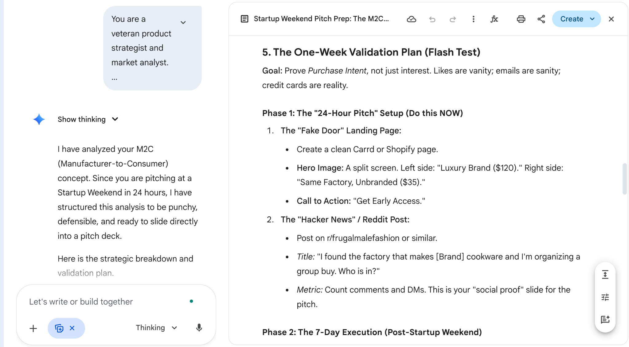 5. A one-week validation plan (landing page, poll, cold outreach, etc.).