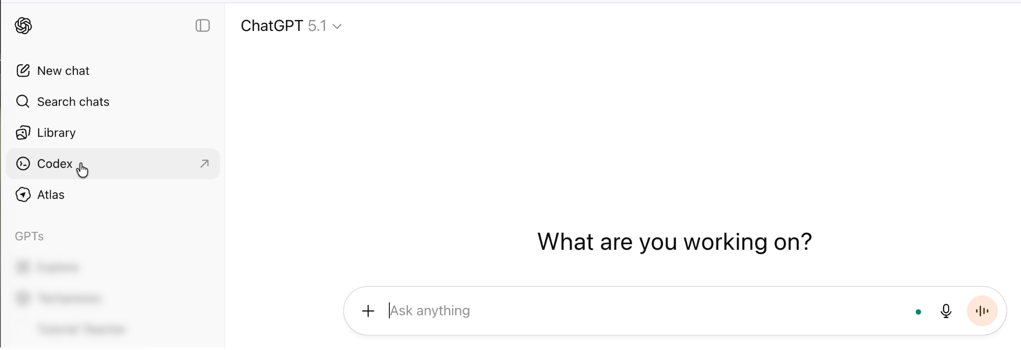 Let’s start by accessing ChatGPT's main interface and clicking ‘Codex’ in the sidebar.